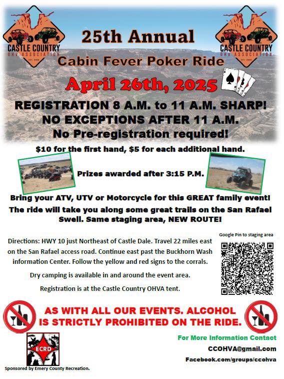 Get ready to rev your engines for an exciting Side-by-Side Poker Ride on April 26th! Join us for a day full of adventure, prizes, and trail-riding fun. Registration runs from 8:00 AM to 11:00 AM. Explore scenic trails, collect cards at designated stops, and aim for the best hand to win big! The fun doesn’t end on the trail—Prizes will be awarded after 3:15 PM, where you could take home some awesome rewards. Whether you’re a seasoned rider or new to the scene, this event promises excitement for everyone. Don’t miss out on the ride of the season!